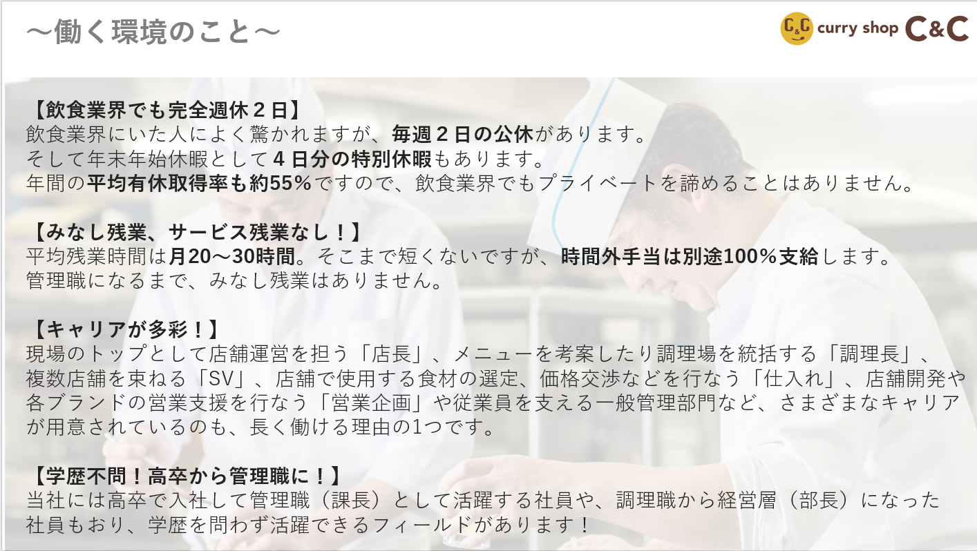 例えば、残業代は管理職になるまで全額支給、平均残業時間は20~30時間程度です。